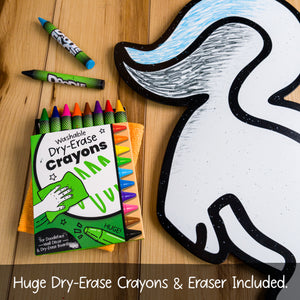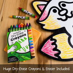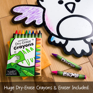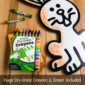 - Color with DoodleFace Wipe-Away Crayons, which stay put and are not messy like markers — no mess, no stress! When it's time for a new look, just wipe the surface with the damp Eraser Cloth and start fresh.