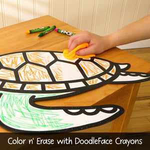 - Color with DoodleFace Wipe-Away Crayons, which stay put and are not messy like markers — no mess, no stress! When it's time for a new look, just wipe the surface with the damp Eraser Cloth and start fresh.