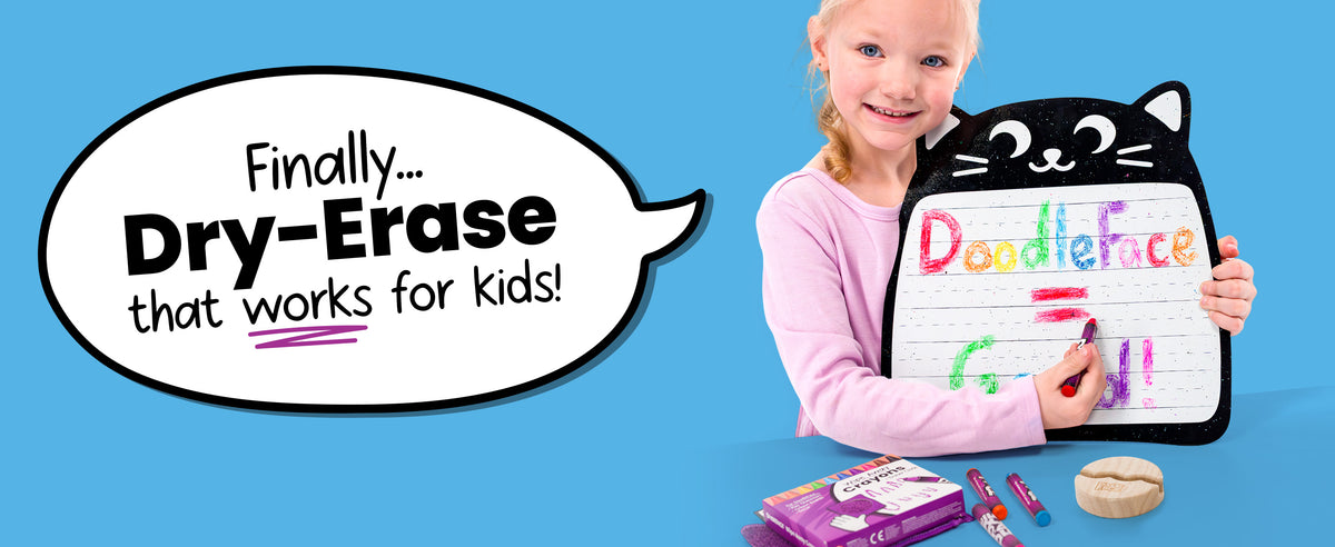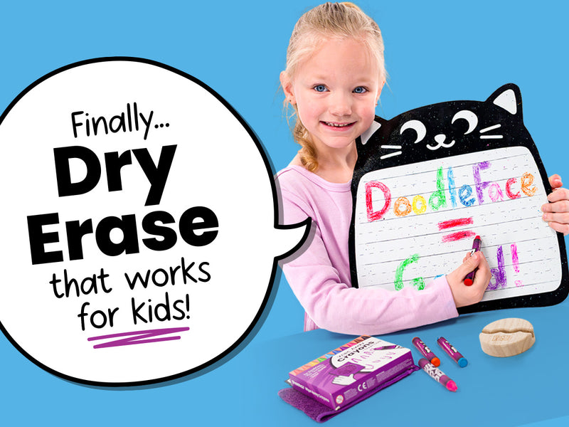 Finally, a dry-erase board designed specifically for kids! The DoodleFace Crayon Board eliminates the frustrations of traditional dry-erase boards: No more dried-out markers, permanent stains, or surfaces that won't erase clean.
