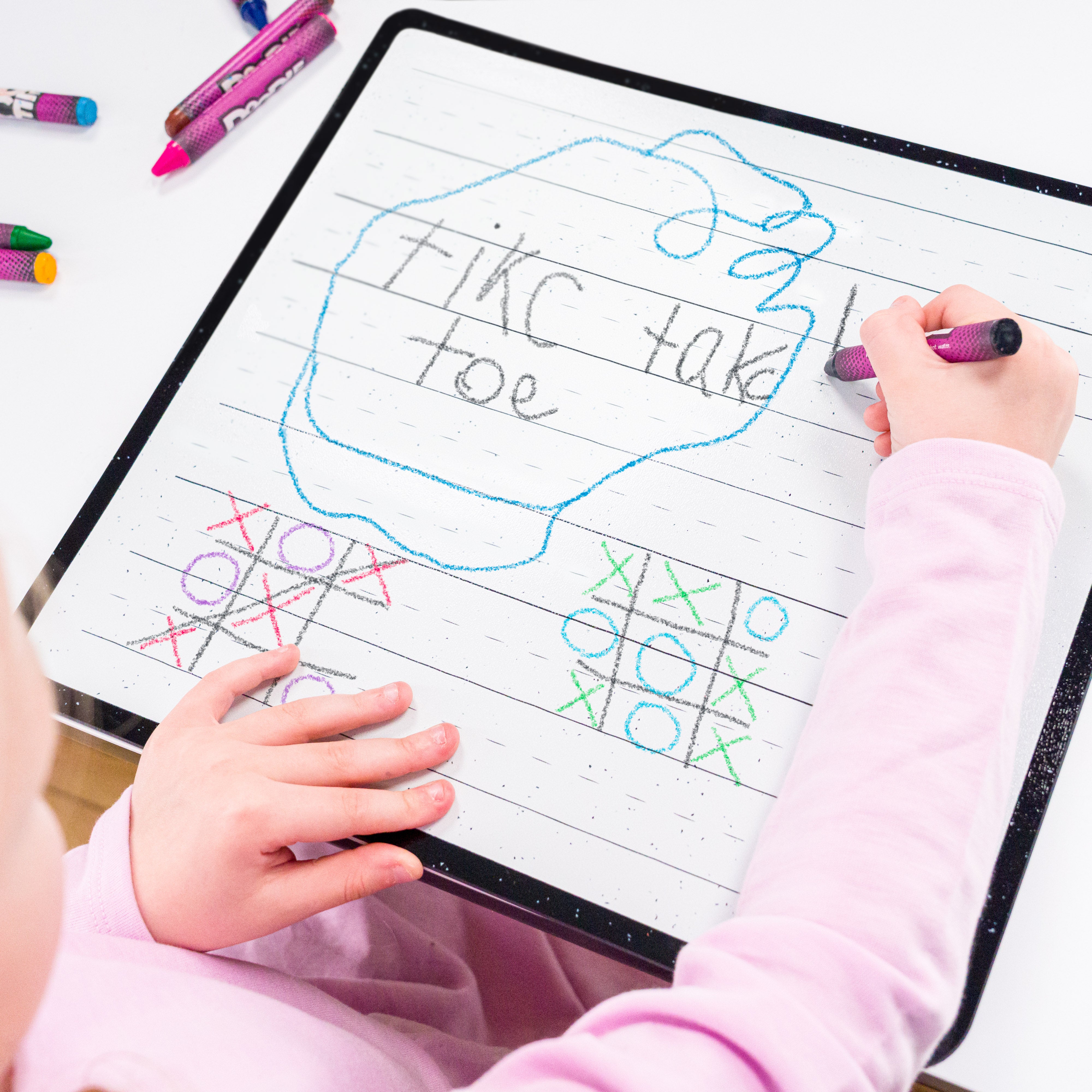 Designed by teachers and occupational therapists, the DoodleFace Lapboard helps children develop fine motor skills, handwriting grip, and coordination through real crayon pressure — skills that digital screens and electronics can’t teach. The double-sided design includes one lined side for writing practice and one dotted side for drawing, math, and creative learning.