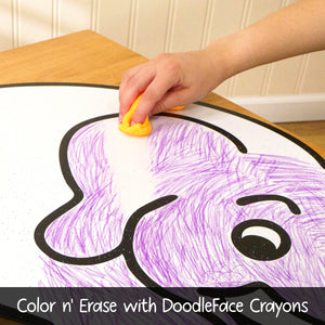 - Color with DoodleFace Wipe-Away Crayons, which stay put and are not messy like markers — no mess, no stress! When it's time for a new look, just wipe the surface with the damp Eraser Cloth and start fresh.