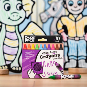 Color, Play, and Wipe Away for Endless Fun. Color with DoodleFace Wipe-Away Crayons. They stay on during play, then magically erase with the included eraser cloth when it is time for a new adventure. Unlike messy dry-erase markers, DoodleFace Crayons never dry out and are perfect for reusable, creative play.