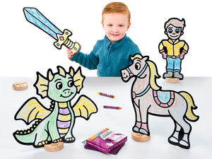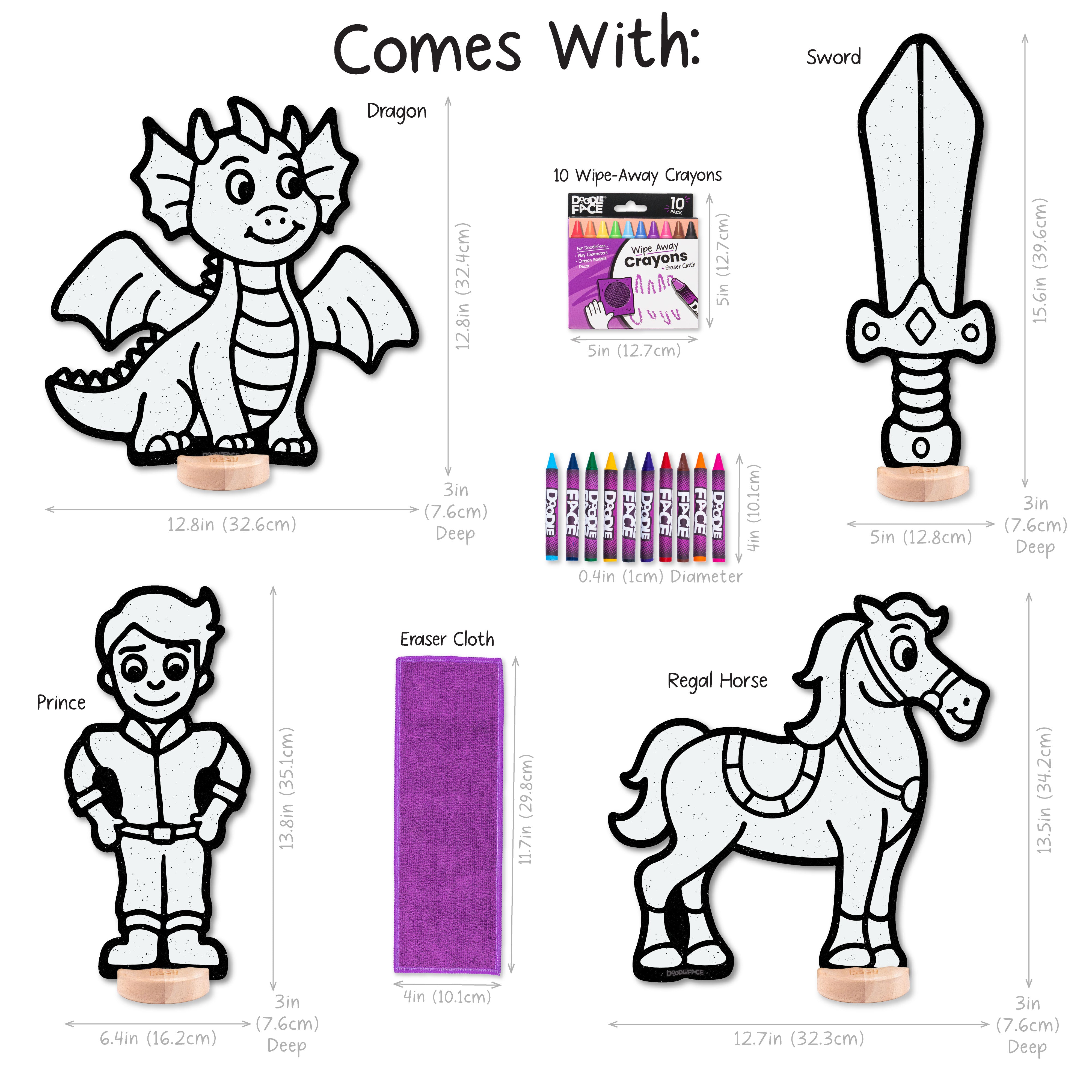 Complete Set for Creative Play. Includes Dragon (12.8 in x 12.8 in), Prince (13.8 in x 6.4 in), Regal Horse (13.8 in x 12.7 in), and Sword (15.6 in x 5 in), 4 solid wooden bases, a jumbo 10 pack of DoodleFace Wipe-Away Crayons, and an eraser cloth. Everything needed for hands-on, imaginative fun.