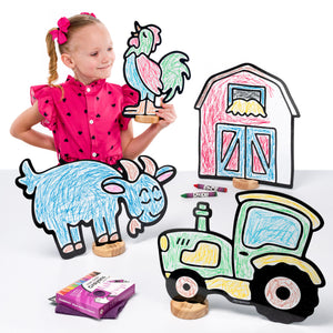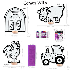 Complete Set for Creative Play. Includes Barn (13.4 in x 11.7 in), Goat (10 in x 14.9 in), Rooster (12.1 in x 8.9 in), and Tractor (11.1 in x 13 in), 4 solid wooden bases, a jumbo 10 pack of DoodleFace Wipe-Away Crayons, and an eraser cloth. Everything needed for hands-on, imaginative fun.