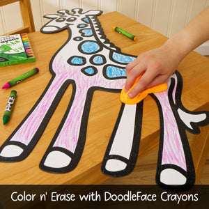 - Color with DoodleFace Wipe-Away Crayons, which stay put and are not messy like markers — no mess, no stress! When it's time for a new look, just wipe the surface with the damp Eraser Cloth and start fresh.