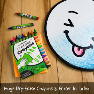 - Color with DoodleFace Wipe-Away Crayons, which stay put and are not messy like markers — no mess, no stress! When it's time for a new look, just wipe the surface with the damp Eraser Cloth and start fresh.