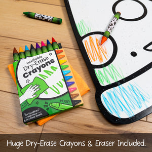 - Color with DoodleFace Wipe-Away Crayons, which stay put and are not messy like markers — no mess, no stress! When it's time for a new look, just wipe the surface with the damp Eraser Cloth and start fresh.