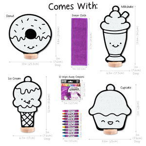 What's Included: Cupcake (11 in x 9.8 in), Donut (9.8 in x 10 in), Ice Cream (12.4 in x 6.7 in), and Milkshake (13.4 in x 6.9 in), 4 solid wooden bases, jumbo 10-pack of DoodleFace Wipe-Away Crayons, and an eraser cloth — everything you need to create, play, and display.