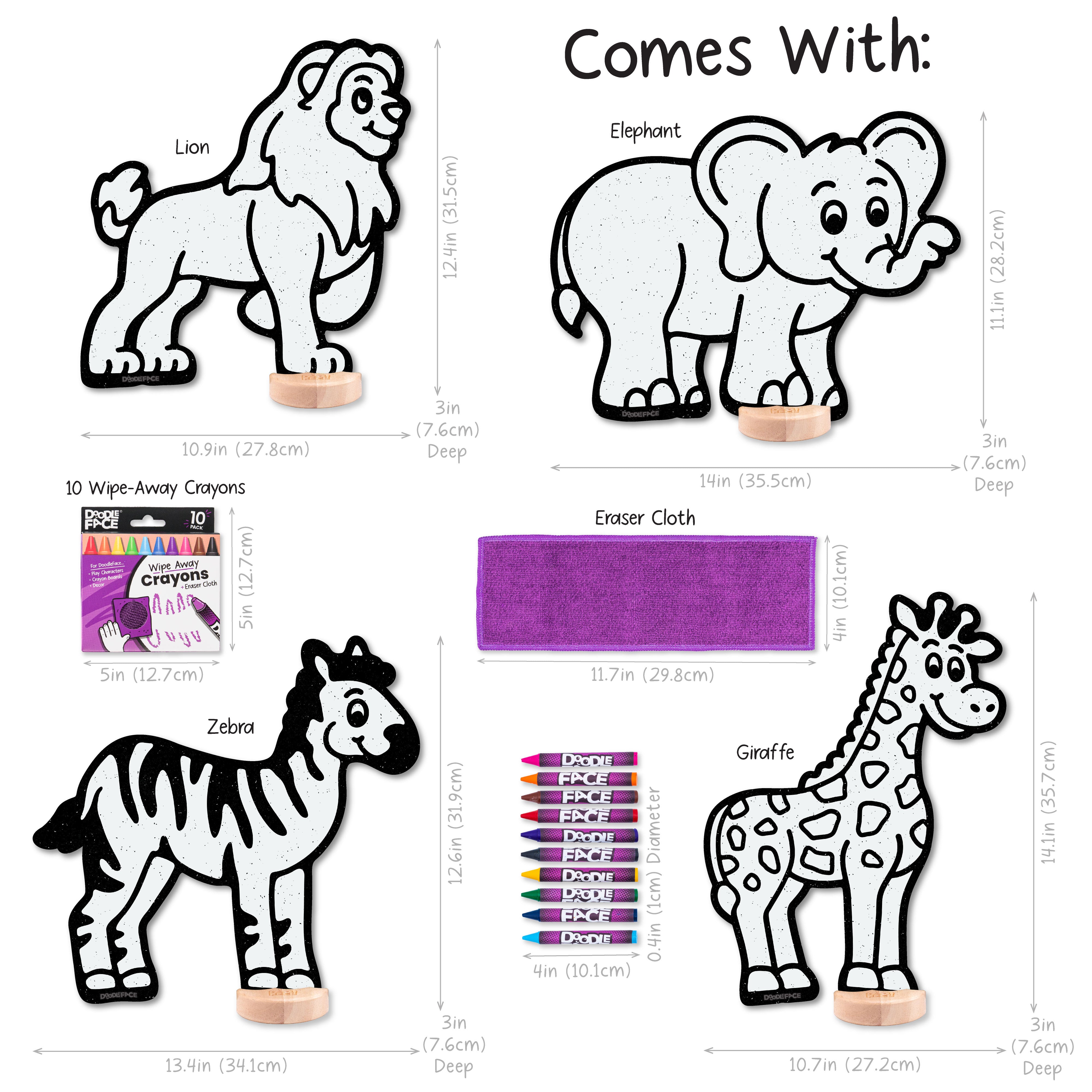 Complete Set for Creative Play. Includes Elephant (11.1 in x 14 in), Giraffe (14.1 in x 10.7 in), Lion (12.4 in x 10.9 in), and Zebra (12.6 in x 13.4 in), 4 solid wooden bases, a jumbo 10 pack of DoodleFace Wipe-Away Crayons, and an Eraser Cloth. Everything needed for hands-on, imaginative fun.