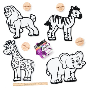 Complete Set for Creative Play. Includes Elephant (10.9 in. x 14 in.), Giraffe (14.4 in. x 10.4 in.), Lion (12.2 in. x 11.3 in.), and Zebra (12.9 in x 13.3 in.) with wood bases, a jumbo 10 pack of DoodleFace Wipe-Away Crayons, and an eraser cloth. Everything needed for hands-on, imaginative fun.