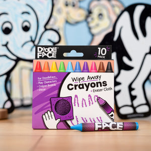 Color, Play, and Wipe Away for Endless Fun. Color with DoodleFace Wipe-Away Crayons. They stay on during play, then magically erase with the included eraser cloth when it is time for a new adventure. Unlike messy dry-erase markers, DoodleFace Crayons never dry out and are perfect for reusable, creative play.