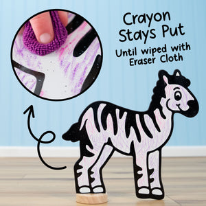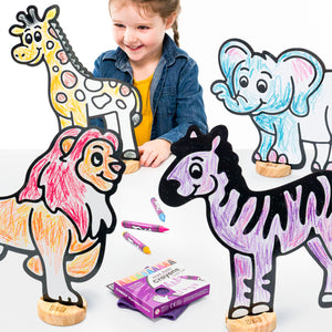 Complete Set for Creative Play. Includes Elephant (11.1 in x 14 in), Giraffe (14.1 in x 10.7 in), Lion (12.4 in x 10.9 in), and Zebra (12.6 in x 13.4 in), 4 solid wooden bases, a jumbo 10 pack of DoodleFace Wipe-Away Crayons, and an Eraser Cloth. Everything needed for hands-on, imaginative fun.