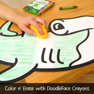 - Color with DoodleFace Wipe-Away Crayons, which stay put and are not messy like markers — no mess, no stress! When it's time for a new look, just wipe the surface with the damp Eraser Cloth and start fresh.