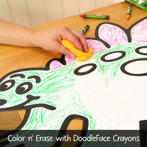 - Color with DoodleFace Wipe-Away Crayons, which stay put and are not messy like markers — no mess, no stress! When it's time for a new look, just wipe the surface with the damp Eraser Cloth and start fresh.