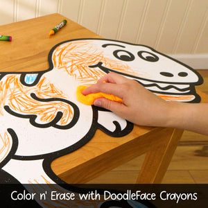 - Color with DoodleFace Wipe-Away Crayons, which stay put and are not messy like markers — no mess, no stress! When it's time for a new look, just wipe the surface with the damp Eraser Cloth and start fresh.