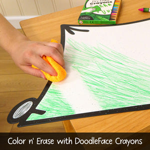 - Color with DoodleFace Wipe-Away Crayons, which stay put and are not messy like markers — no mess, no stress! When it's time for a new look, just wipe the surface with the damp Eraser Cloth and start fresh.