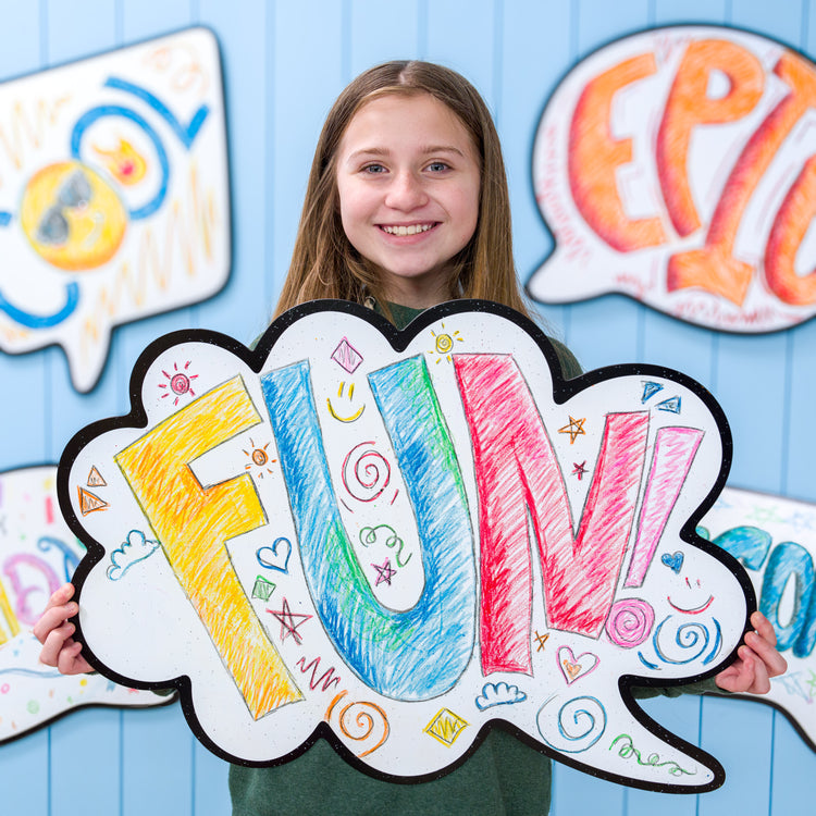 What's Included: Speech Bubble Crayon Boards, 10 DoodleFace Wipe-Away Crayons, Eraser Cloth, Wall Mounting Snap with Command Strip.