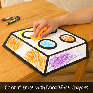- Color with DoodleFace Wipe-Away Crayons, which stay put and are not messy like markers — no mess, no stress! When it's time for a new look, just wipe the surface with the damp Eraser Cloth and start fresh.