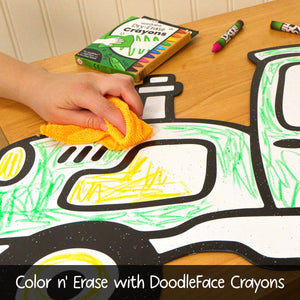 - Color with DoodleFace Wipe-Away Crayons, which stay put and are not messy like markers — no mess, no stress! When it's time for a new look, just wipe the surface with the damp Eraser Cloth and start fresh.