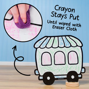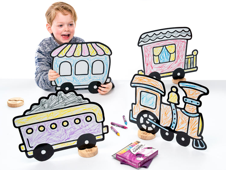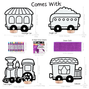Complete Set for Creative Play. Includes Caboose (10.7 in x 13.8 in), Freight Car (10.9 in x 13.2 in), Passenger Car (10.5 in x 12.1 in), and Train Engine (11 in x 13.9 in), 4 solid wooden bases, a jumbo 10 pack of DoodleFace Wipe-Away Crayons, and an eraser cloth. Everything needed for hands-on, imaginative fun.