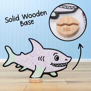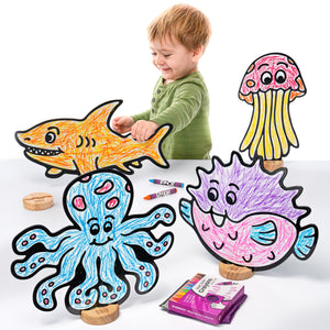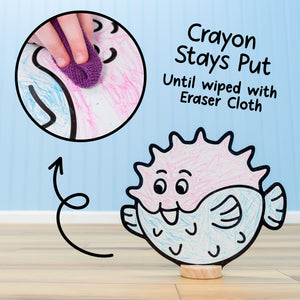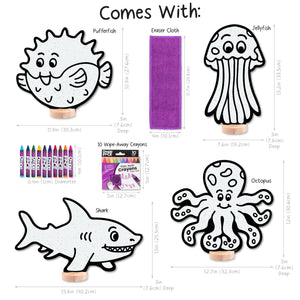 Complete Set for Creative Play. Includes Jellyfish (13.2 in x 7.6 in), Octopus (12 in x 12.7 in), Pufferfish (10.9 in x 11.9 in), and Shark (10 in x 15.8 in), 4 solid wooden bases, a jumbo 10 pack of DoodleFace Wipe-Away Crayons, and an eraser cloth. Everything needed for hands-on, imaginative fun.