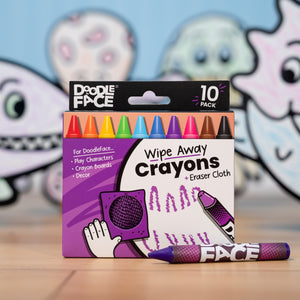 Color, Play, and Wipe Away for Endless Fun. Color with DoodleFace Wipe-Away Crayons. They stay on during play, then magically erase with the included eraser cloth when it is time for a new adventure. Unlike messy dry-erase markers, DoodleFace Crayons never dry out and are perfect for reusable, creative play.
