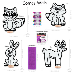 Complete Set for Creative Play. Includes Deer (14.4 in x 12.4 in), Fox (12.1 in x 10.5 in), Rabbit (13.7 in x 8.1 in), and Raccoon (12.8 in x 11.5 in), 4 solid wooden bases, a jumbo 10 pack of DoodleFace Wipe-Away Crayons, and an eraser cloth. Everything needed for hands-on, imaginative fun.